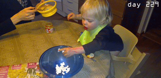The winning lot was drawn yesterday evening April 9th using a highly scientific method. All 60 correct answers got assigned a number according to the chronological order of replies coming in. All numbers were put in a blue salad bowl. And the lil’ princess drew the winning lot. With all the mango puree being delivered at a constant interval the same time, she was a bit in a hurry and her focus slightly distracted from this honorary appointment. She accidentially picked three. But since the salad bowl indicated food, we counted only the one that arrived in her mouth.